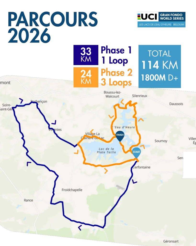 BelgiqueGranfondo Belgium fait partie du circuit UCI Gran Fondo World Series depuis 2025 et se déroule à Lac de l’Eau d’Heure, station balnéaire du sud de l’Angleterre, située entre les lacs. Le parcours serpente à travers la région frontalière franco-belge.
